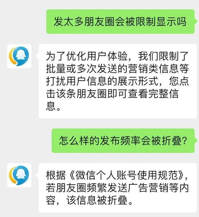 腾讯客户称,根据《微信个人账号使用规范》,若朋友圈频繁发送广告营销等内容,该信息被折叠。