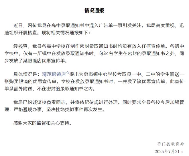 石门县教育局7月21日深夜发布情况通报称:近日,网传我县在高中录取通知书中混入广告单一事引发关注开云app官方版入口。我局高度重视,迅速组织开展核查。现将相关情况通报如下: